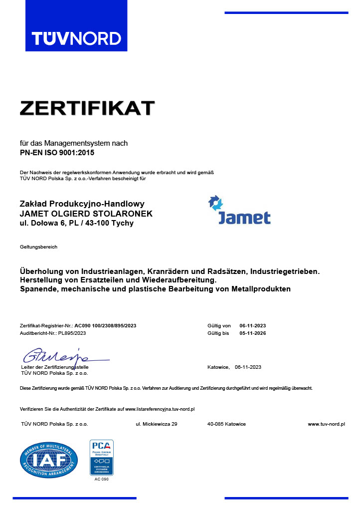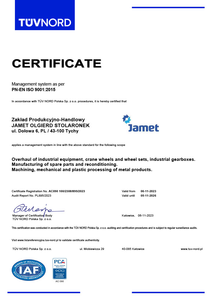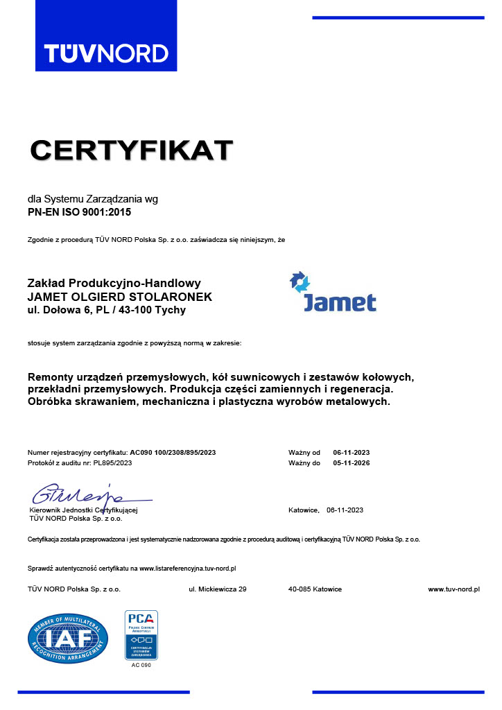Od 1984 roku Z.P.H. JAMET w Tychach zajmuje się serwisowaniem urządzeń przemysłowych oraz produkcją części maszyn i konstrukcji stalowych na potrzeby hutnictwa, motoryzacji i innych gałęzi przemysłu. Oferujemy kompleksowe naprawy w ramach zleceń stałych lub doraźnych. Naszym autorskim rozwiązaniem są złącza obrotowe, które umożliwiają doprowadzenie cieczy chłodzącej do elementów obrotowych.